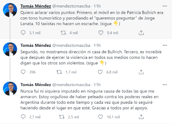 Este domingo, luego de enterarse que los directivos decidieron echarlo tras la manifestación que organizó en la casa de Bullrich, Méndez publicó un hilo en su cuenta de Twitter. “Quiero aclarar varios puntos. Primero, el móvil en lo de Patricia Bullrich era con tono humorístico y parodiando el ‘queremos preguntar’ de Jorge Lanata. Diez taxistas no hacen un escrache”, comenzó.