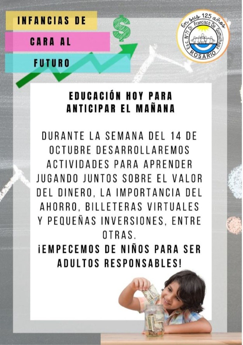 Para 1º B y 2º B se prevé la iniciativa denominada “Mi propio dinero” Se presentará físicamente y se explicarán todos los tipos de billetes y monedas que hay, su denominación y equivalencias, y se invitara a los niños y niñas a crear sus propias monedas y billetes, para luego poder utilizarlos y trabajar proponiendo a los estudiantes de primero y segundo grado crear un juego que se llamará "El Cine de la Gurru".