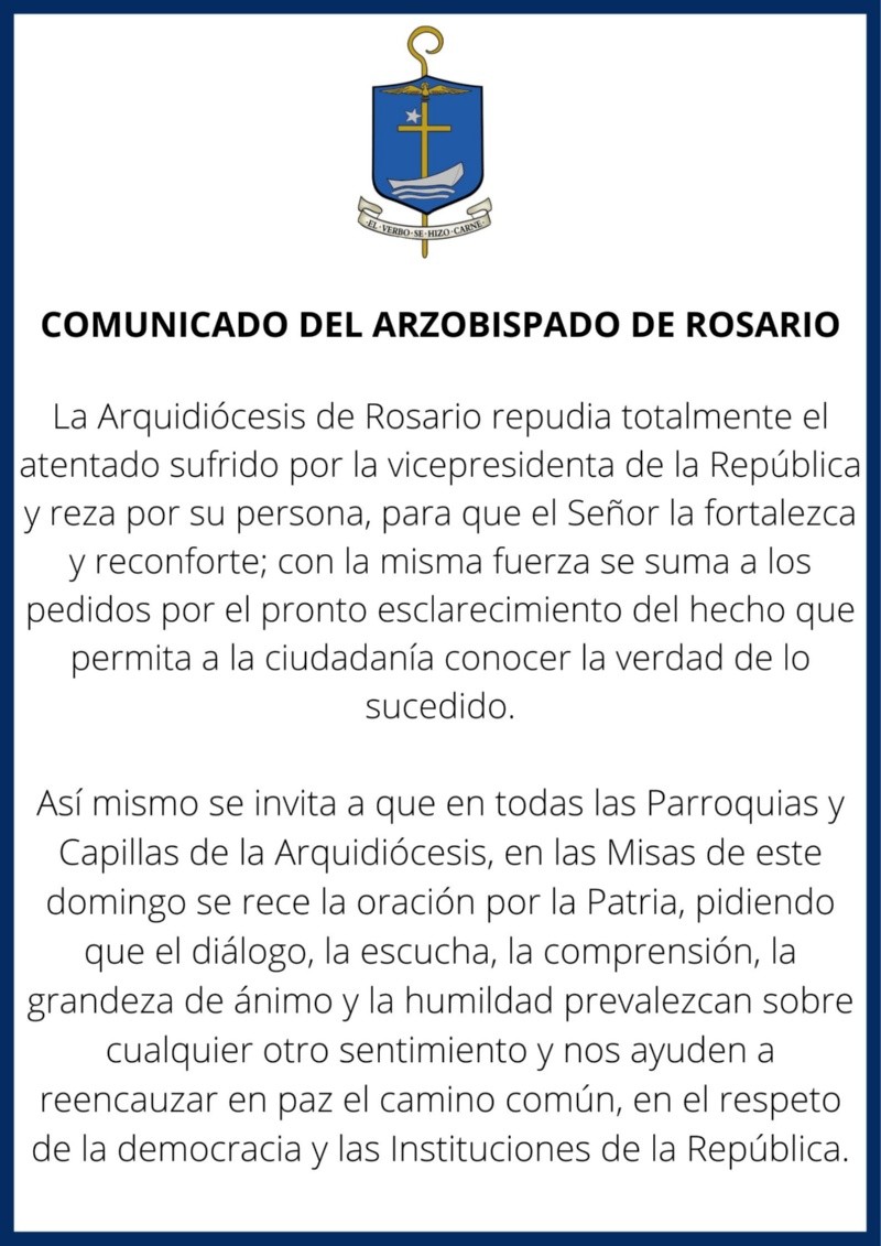 "La Arquidiócesis de Rosario repudia totalmente el atentado sufrido por la vicepresidenta de la República y reza por su persona, para que el Señor la fortalezca y reconforte", escribieron.