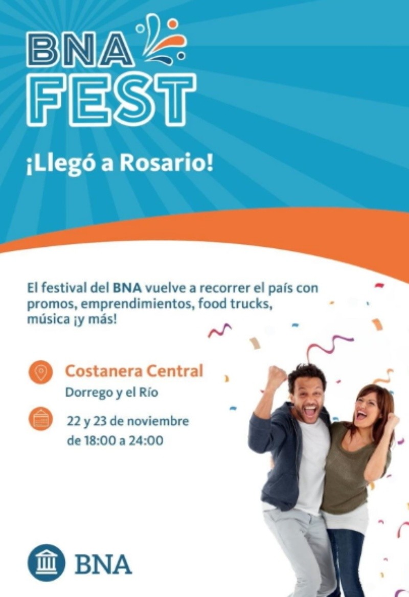 El BNA Fest, el festival itinerante del Banco Nación, regresa y dará inicio a su nueva temporada en Rosario. El evento se realizará el sábado 22 y domingo 23 de noviembre, con entrada libre y gratuita, en Dorrego y el Río.