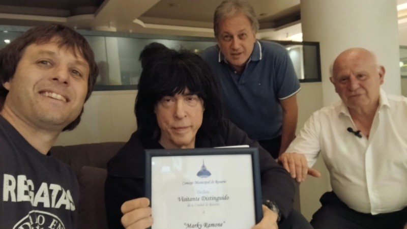 Marky Ramone estuvo en Rosario este viernes por la noche y el Concejo aprovechó la oportunidad para declararlo visitante distinguido de la ciudad. El músico de 72 años tocó en La Sala de las Artes y antes del show recibió la distinción de manos del secretario General del municipio, Miguel Tessandori.