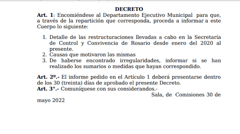 Además, el texto hacía referencia explícita a que “en el caso de haber encontrado irregularidades”, se informe también al Concejo sobre sumarios o medidas que se hayan tomado al respecto. Todo esto con un plazo no mayor a los 30 días de aprobado.