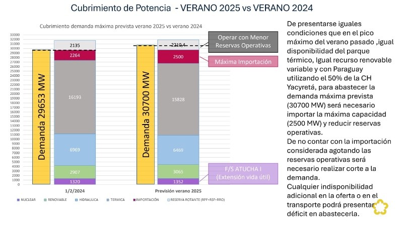 A fines de junio último, la Compañía Administradora del Mercado Mayorista Eléctrico (Cammesa) publicó un informe en el que advirtió que el total de energía producida en el parque local de generación, sumado a las importaciones de electricidad desde países vecinos, no alcanzará para abastecer los picos de demanda proyectados para el verano próximo teniendo en cuenta las altas temperaturas que se esperan para fines de 2024 y los primeros meses de 2025. En su "Informe de abastecimiento", Cammesa señaló que el consumo de energía podría llegar a los 30.700 megawatt (MW), es decir, más de 1.000 MW por encima del récord histórico registrado en febrero de este año. En ese escenario, podrían registrarse cortes masivos del suministro eléctrico en el país. Esas proyecciones, cabe mencionar, contemplaron la salida de servicio de Atucha I desde fines de septiembre. "Los problemas de potencia para el cubrimiento del pico en situaciones extremas, como las de febrero de 2024, continúan durante todo el período de análisis [2025-2027], dado que no se prevén mejoras en el perfil de la oferta", apuntaron desde la empresa privada, pero con control estatal.