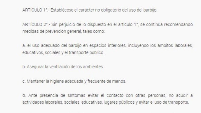 Desde este miércoles, el gobierno nacional le puso fin a la obligatoriedad del uso del barbijo. De igual manera, mantiene la recomendación de su uso en espacios cerrados, en centros educativos y en el transporte público. Asimismo, se aclaró que cada jurisdicción tendrá autonomía y podrá decidir qué hacer frente a su situación epidemiológica particular.
