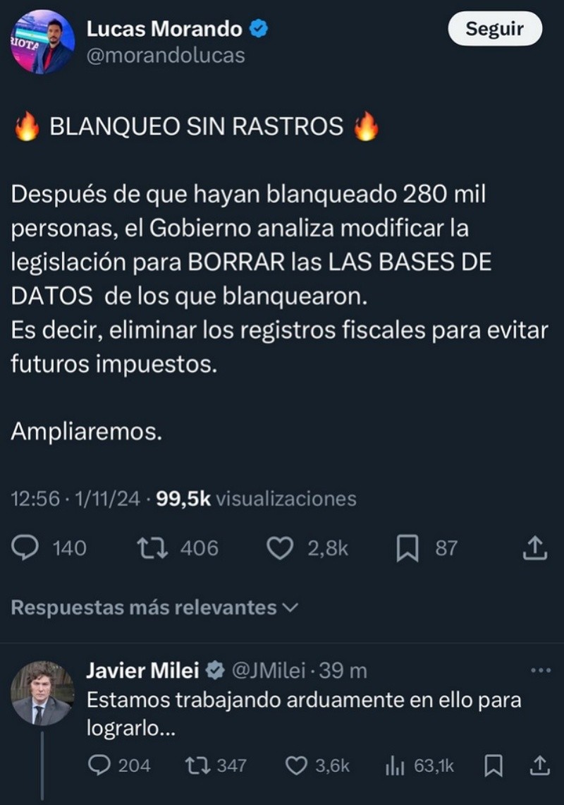 "El blanqueo es un éxito rotundo y vamos a extender la primera etapa del blanqueo hasta el 8 de noviembre, luego de que más de 280.000 argentinos hayan confiado en el nuevo rumbo de la Argentina", publicó Milei en su cuenta de X, refiriéndose a los resultados de la regularización patrimonial que volvió a extenderse, esta vez hasta el 8 de noviembre.