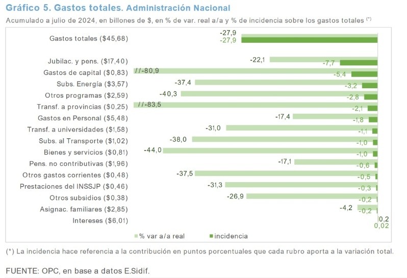 El recorte de gastos aplicado por el gobierno de Javier Milei en la administración nacional desde que comenzó el año representó en julio una baja de 22% en los fondos para jubilaciones, del 31% en las transferencias a universidades y 83% en los giros a las provincias, siempre comparando con el mismo período del año pasado. Los datos se desprenden del Análisis de Ejecución Presupuestaria elaborado y publicado por la Oficina de Presupuesto del Congreso.