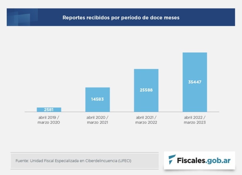 Más de 35.000 ciberdelitos fueron reportados en Argentina entre abril de 2022 y marzo del 2023, lo cual equivale a un aumento del 38 por ciento de los casos en comparación a los 12 meses previos, según un informe realizado por la Unidad Fiscal Especializada en Ciberdelincuencia (Ufeci), que catalogó la situación como "preocupante" ya que evidencia una "consolidación" de este tipo de hechos tras la pandemia.