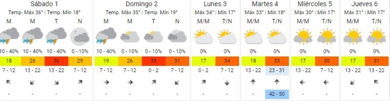 Para este sábado 1º de enero, se pronostican tormentas aisladas durante todo el día con 18 grados de mínima y 36 de máxima.