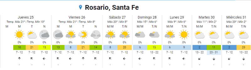 Para el viernes la mínima prevista es de 8 y la máxima de 21. Luego el sábado y domingo el clima se mantendría parcialmente nublado, con temperaturas entre los 6 y 8 grados y máximas entre los 15 y 20 grados.