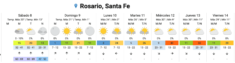 De acuerdo al reporte del Servicio Meteorológico Nacional (SMN), la máxima prevista para este sábado es de 20ºC, el viento sopla del sur a 29 kilómetros en la hora y la humedad se ubica en el 40 por ciento.