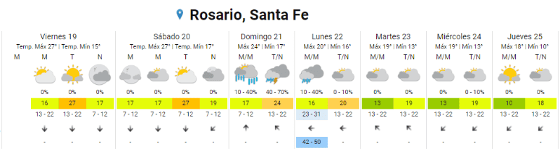 Este viernes Rosario amaneció bajo un cielo despejado que se mantendría durante toda la jornada. Según indicó el Servicio Meteorológico Nacional, la mínima en las primeras horas era de 15 grados y se espera una gran amplitud térmica con una máxima que alcanzaría los 27 grados.