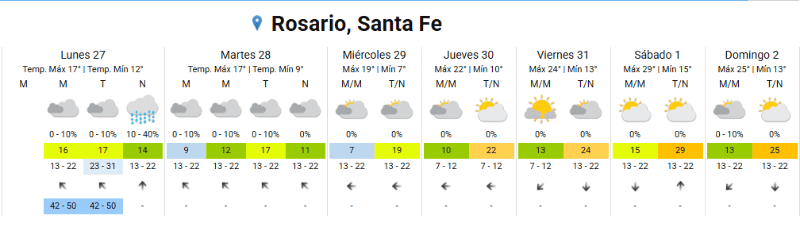 Este lunes Rosario amaneció con mucho viento y un cielo totalmente cubierto de nubes que amenazan con algunas lloviznas durante la jornada que podrían llegar durante la noche.