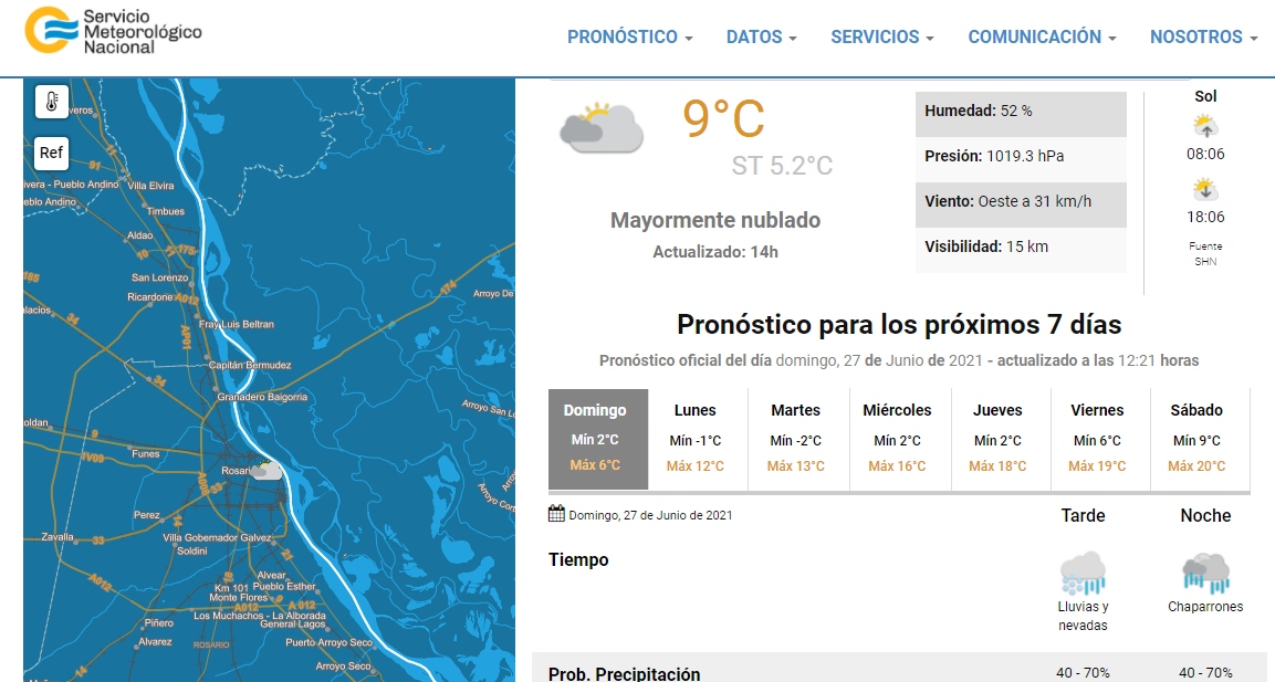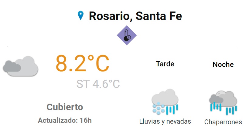 El Servicio Meteorológico Nacional indicó este domingo en su cartilla que "lluvias y nevadas" podrían llegar durante la tarde y chaparrones por la noche. No obstante, la nevada no se dio en Rosario este domingo.