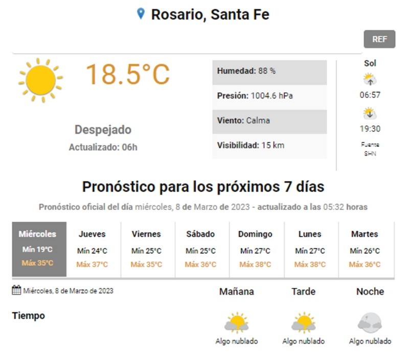 El calor no da tregua y para este miércoles se esperan, otra vez, altas temperaturas. El día empezó con 18 grados y la máxima alcanzará los 35. Según indica el Servicio Meteorológico Nacional (SMN), el cielo en Rosario estará despejado hasta la noche y las probabilidades de lluvia se alejaron.