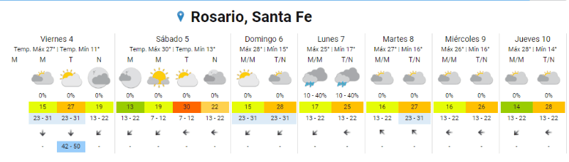 Este viernes Rosario amaneció con 11 grados de mínima y se espera otra jornada primaveral en donde la máxima llegaría los 27 grados. El cielo estaría parcialmente nublado y la humedad se posicionaría en 61 por ciento.