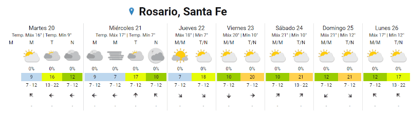 Para lo que resta de la semana, se espera un leve ascenso de las temperaturas mínimas y máximas hasta llegar el domingo próximo a 21 grados. Sin lluvias en el horizonte a persar de la alta humedad.