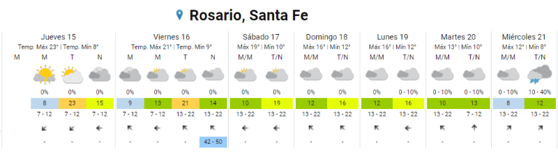 Este jueves, Rosario amaneció con un cielo despejado y con 8 grados de mínima. Según el Servicio Meteorológico Nacional (SMN) se espera una jornada superagradable con una máxima que superaría los 23 grados y que se podrá disfrutar al aire libre, ya que no habrá presencia de nubes.