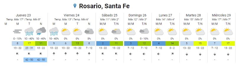 Este jueves Rosario amaneció inestable con un alto porcentaje de humedad y con 7 grados de mínima. La máxima prevista es de 17 grados. Según el Servicio Meteorológico Nacional, se espera una jornada nublada con muchas chances de lluvias para todo el día.