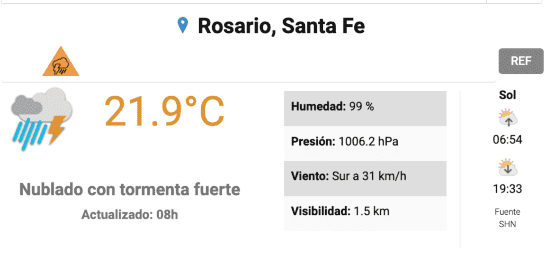 De acuerdo al SMN, cerca de las 8 de la mañana la temperatura en la ciudad rondaba los 22 grados (la máxima prevista es de 27), la humedad se mantenía en el 99% y el viento soplaba desde el sur a 31 kilómetros en la hora. Producto de las fuertes precipitaciones, la visibilidad es de 1.5 kilómetros, por lo que se pide extremar los cuidados en el caso de conducir tanto en rutas y autopistas de la región como en el éjido urbano.