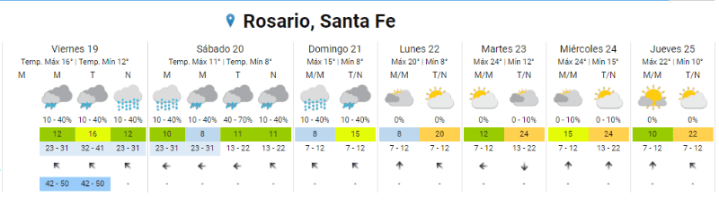 El SMN indicó lluvias también para todo el fin de semana, precisamente sábado y domingo. En cuanto a temperatura, la mínima sería de 8 y la máxima apenas los 15.