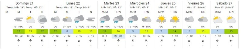 El lunes arrancará algo fresco, con 8 grados por la mañana, y hacia la tarde podrían registrarse precipitaciones aisladas. El termómetro llegaría también a 19 grados.