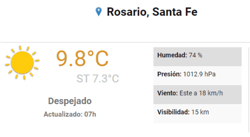 Rosario amaneció este martes 4 de octubre con 9.8 grados que en la sensación térmica parecían ser 7.3ºC. Pese a este fresco despertar, la máxima prevista para la jornada es de 27 grados a los que se llegará pasado el mediodía.