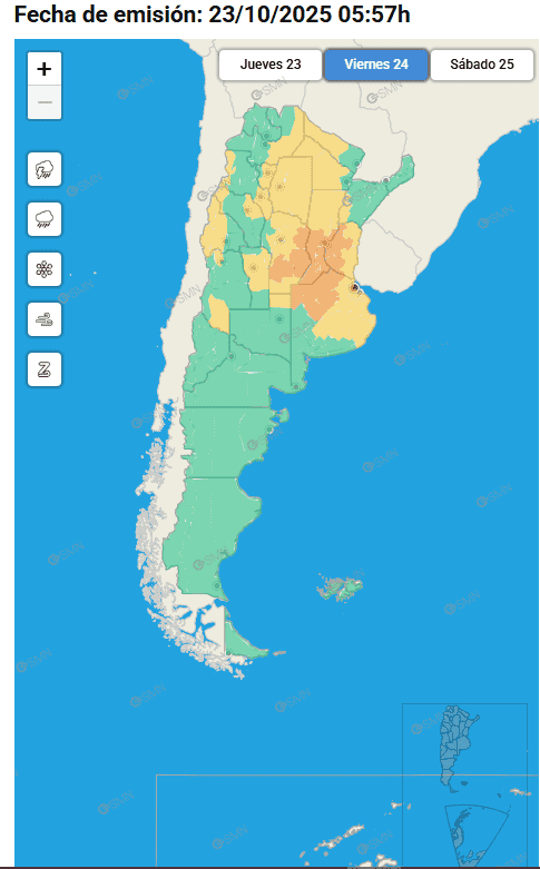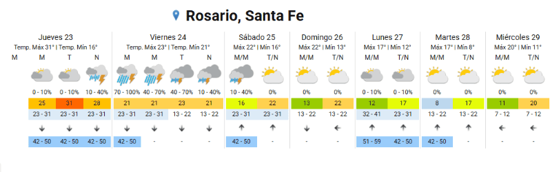 El día de mayor preocupación será el viernes, cuando se espera el paso de un frente de tormenta fuerte que motivó la emisión de una alerta naranja para la mañana por parte del SMN para sur y centro de Santa Fe.