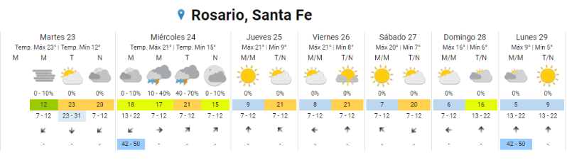 Para el miércoles el panorama climático cambiaría con la llegada de lluvias y tormentas durante la tarde. Para el jueves habría un pequeño descenso de temperatura que se mantendría al menos hasta el lunes próximo.