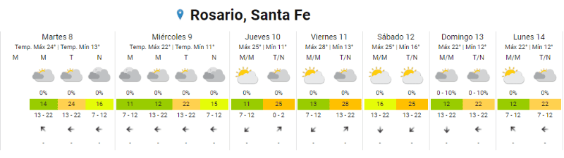 Para el miércoles, las condiciones climáticas serían las mismas, con 11 grados de mínima y 22 de máxima. Con el correr de los días seguiría subiendo la temperatura, llegando al viernes con una máxima de 28.