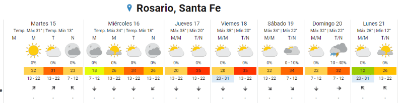 Rosario amaneció este martes con 14 grados que podrían llegar a 31 de máxima. De acuerdo al reporte del Servicio Meteorológico Nacional (SMN), la humedad se ubica en el 58 por ciento y la presión en 1010.6 hPa. Estas condiciones permiten una correcta visibilidad en la región a 15 kilómetros.