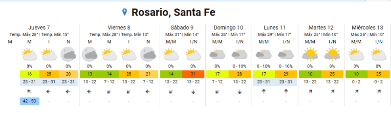 Para el viernes, se espera un cielo parcialmente nublado y buen tiempo, las marcas térmicas oscilarán entre los 13 y los 28 grados. La rotación del viento al sector norte presagian un fin de semana caluroso en Rosario.