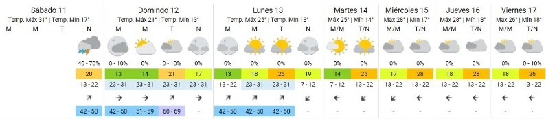 El lunes 13, el tiempo mejorará. Se anticipa un cielo soleado con una temperatura mínima de apenas 13° y una máxima de 25°.