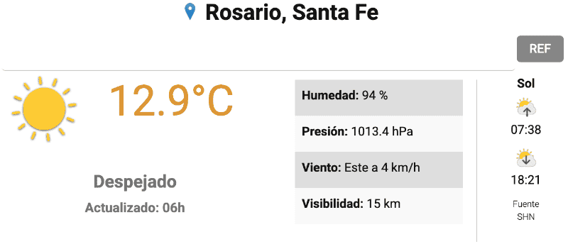 De acuerdo al reporte del Servicio Meteorológico Nacional (SMN) para la jornada se espera una máxima de 28 grados y cielo completamente despejado, por lo que será un día de sol pleno. A eso se le suma una leve brisa soplando desde el este y la presión en 1013.4 hPa.
