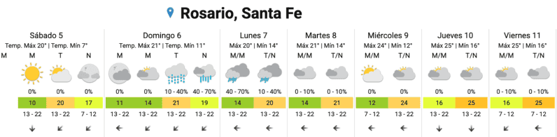 De cara a lo que se viene, el SMN anticipa para el domingo condiciones similares a las de este sábado, con la salvedad de que podría estar más nublado y sobre la tarde noche ingresaría un frente de tormentas a la región. Ante esto, aumentan las probabilidades de lluvia durante el cierre del fin de semana y el inicio del lunes.