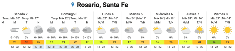 De cara al domingo, se espera un descenso sostenido de temperatura con muy poca amplitud térmica. La máxima prevista es de 22 y la mínima se va a ubicar en los 19. Esto se mantendría, en principio, durante el resto de la semana.