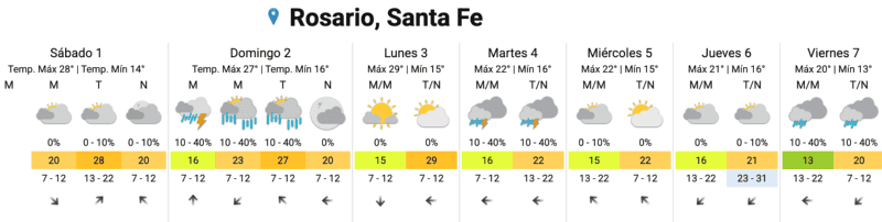 A partir de la madrugada el SMN anticipa el ingreso de un frente inestable a la región que traerá aparejadas abundantes precipitaciones. Esto hace que para el domingo se esperen lluvias durante todo el día, aunque en principio la temperatura no variará demasiado de la de este sábado: 27ºC.