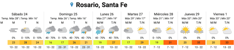 Rosario amaneció con un sábado para el respiro en medio de las jornadas de calor extenuante y las de lluvia. La máxima prevista es de 28 grados con cielo despejado y un sol presente. Tanto el domingo, como el lunes, hay probabilidades altas de lluvias en toda la región.