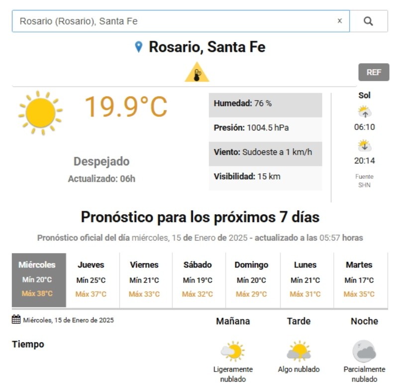 La ciudad de Rosario amaneció con el cielo despejado y una temperatura agradable de 20 grados. Sin embargo, a salir con la botellita de agua en el bolso porque, según señala el Servicio Meteorológico Nacional (SMN), será un miércoles sofocante.