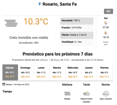 Este sábado 7 de mayo se espera un lindo día otoñal. Desde temprano el sol se hacía ver sobre el cielo rosarino y ayudó a subir la mínima a los 10.3 grados con los que se inició la jornada. Por el momento, no aparecen lluvias en el radar.