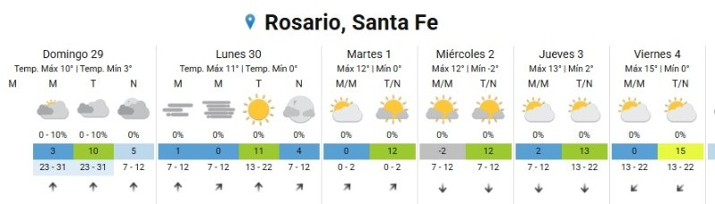 El Servicio meteorológico Nacional (SMN) pronostica para este domingo en Rosario una jornada muy fría, con cielo algo nublado, vientos del sector sur y una temperatur. máxima de 10 grados.