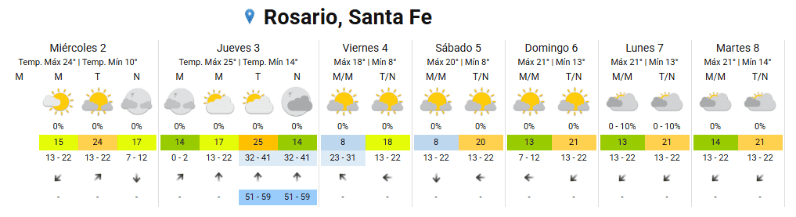 El jueves presentaría condiciones similares a las del miércoles y con ráfagas de viento sur durante la tarde y la noche, siempre de acuerdo al pronóstico oficial del SMN, en tanto que el viernes la temperatura bajaría: anuncian 8 de mínima y apenas 18 de máxima.