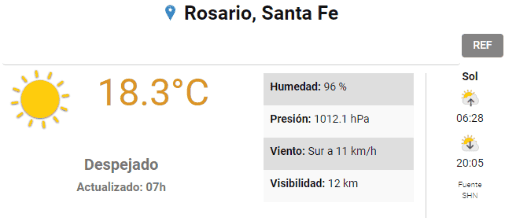 Es que la ciudad amaneció con cielo completamente despejado, 18.3ºC, viento sur soplando a 11 km/h, la humedad en el 96 por ciento y la presión en 1012.1 hPa. Para lo que resta del día se espera que la temperatura empiece a subir hasta llegar a los 29 grados.