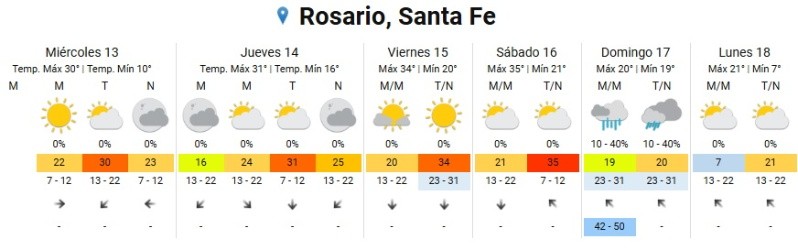 El pronóstico para este jueves anticipa cielo parcialmente nublado, con una amplitud térmica entre 16 y 30 grados. En tanto que para el viernes, el SMN pronostica cielo algo nublado, con una mínima de 20 y una temperatura máxima de 34 grados, y vientos persistentes del sector norte.