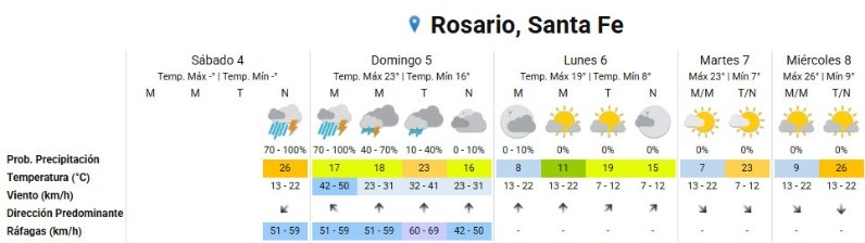 De todos modos, las lluvias abundantes para el departamento Rosario y otros del sur provincial no será lo único a prestarle atención. A esto, se suma una advertencia por viento para la tarde del domingo, ante lo cual la Municipalidad de Rosario reiteró recomendaciones preventivas a tener en cuenta.