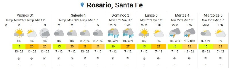 El Servicio Meteorológico Nacional (SMN) pronostica para este viernes, último día de octubre y previa de Halloween, una jornada con buen tiempo, cielo parcialmente nublado y una temperatura máxima de 26 grados. Los vientos del sector norte impulsarán las marcas térmicas hacia arriba en el inicio de un fin de semana, que podría coronarse con lluvias.