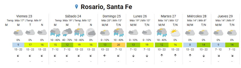 Este viernes Rosario amaneció con un cielo algo nublado y un porcentaje alto de humedad. La temperatura mínima en las primeras horas de la mañana era de 9 grados y se espera una jornada bien otoñal con una temperatura máxima de 19 grados.