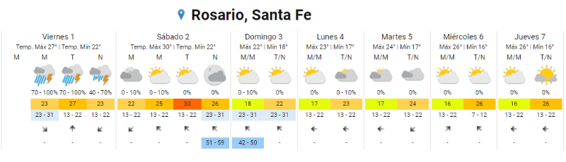 Tras las lluvias de este viernes, el sábado el tiempo mejorará. El SMN pronostica que el cielo estará parcialmente nublado con máximas de 30 grados. Pero la llegada de vientos y un frente frío provocarán un descenso de los registros para el domingo y el lunes, donde las máximas apenas llegarían a 24.