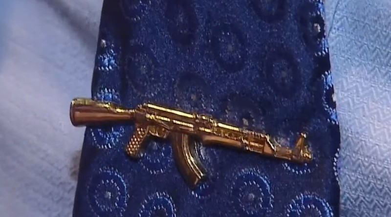 Al igual que su comitiva con la que viajó, el referente de la ultraderecha brasileña lució un llamativo corbatero con la forma de una ametralladora ak-47 dorada que, según explicó, representa el “movimiento pro armas, en defensa de la propiedad privada de las armas”, y “la legítima defensa”.