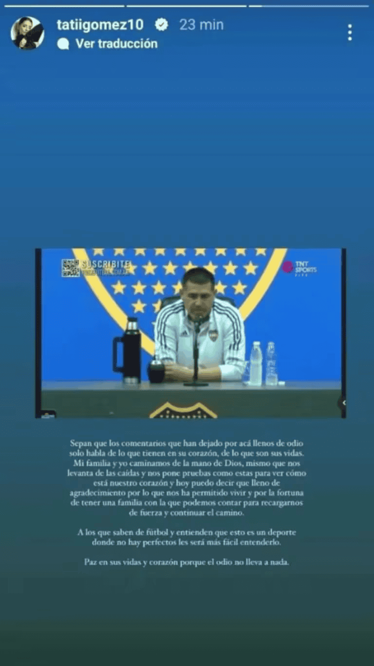 A través de su cuenta de Instagram, Gómez reposteó la defensa que hizo Juan Román Riquelme a Fabra y redactó: "Sepan que los comentarios que han dejado por acá, llenos de odio, solo habla de lo que tienen en su corazón, de lo que son sus vidas".
