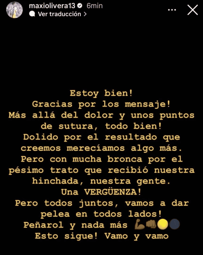 “Estoy bien! Gracias por los mensajes. Más allá del dolor y unos puntos de sutura, todo bien! Dolido por el resultado que creemos merecíamos más. Pero con mucha bronca por el pésimo trato que recibió nuestra hinchada, nuestra gente. Una VERGÜENZA! Pero todos juntos, vamos a dar pelea en todos lados! Peñarol y nada más. Esto sigue! Vamo y vamo”, publicó el futbolista en su cuenta de Instagram.